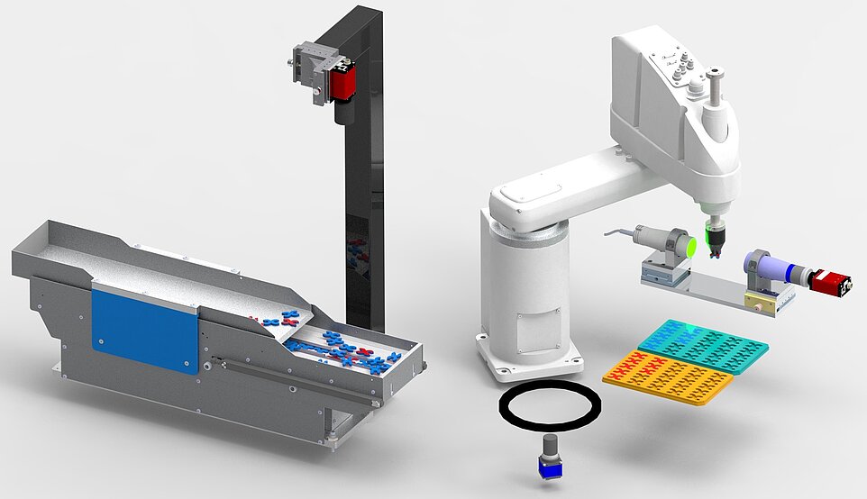 Skalierbares System: Durch die Wahl von passender Fördereinheit und Robotertyp können Teilegrössen von 5 x 5 mm bis 150 x 150mm verarbeitet werden. Das modulare System ermöglicht den Einsatz von SCARA Robotern mit grosser Reichweite, Sechsachsrobotern, Mehr-kamerasystemen auf PC-Basis oder Cognex In-Sight für High Speed Anwendungen.